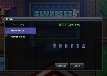 Zlurpiees sells blue and green soda for 8,000 and 4,000 Gralats